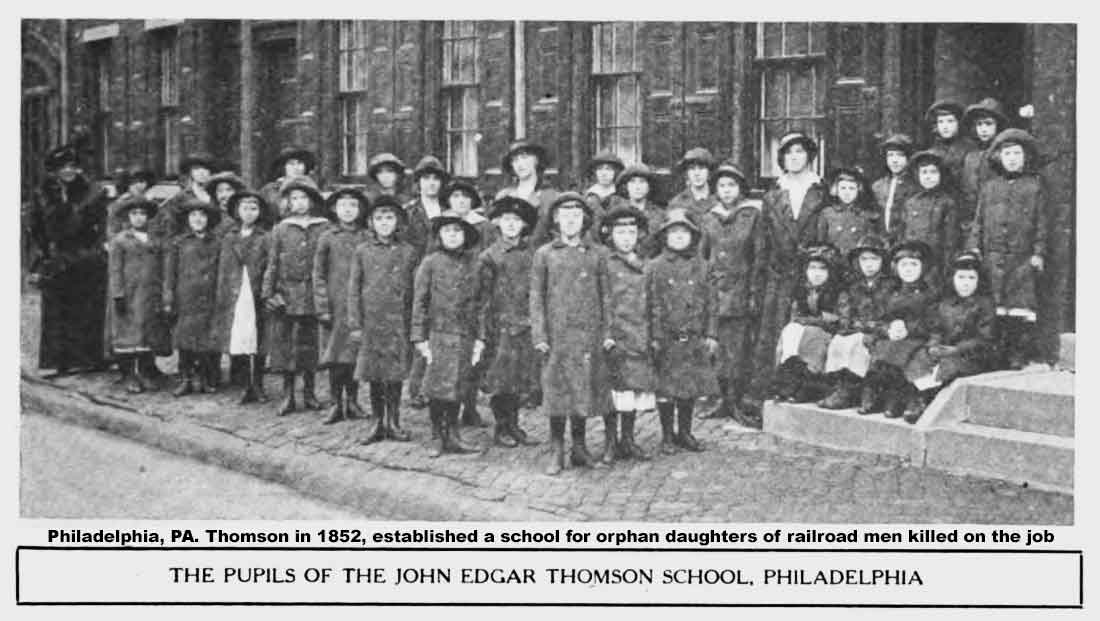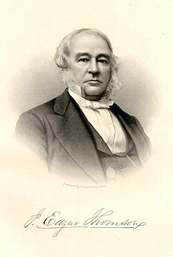 Born February 10, 1808, John Edgar Thomson was an entrepreneur best known for his leadership of the Pennsylvania Railroad (PRR) from 1852 until his death in 1874. Thomson made it the largest business enterprise in the world and a world-class model for technological and managerial innovation. Previously the railroad's first chief engineer, he became its third president. Thomson began his railroad career at age 19 as a rodman working in a survey crew locating the Philadelphia and Columbia Railroad; later he worked for Camden and Amboy Railroad. In 1832 he sailed to Great Britain, making an inspection tour of the new railways constructed in the country. Through his father's influence, he became a member of Pennsylvania state's engineer corps, surveying routes for a rail line west from Philadelphia. He was soon promoted to assistant engineer, and in 1830, when the line of the Camden & Amboy Railroad was located across the state of New Jersey, Thomson was placed in charge of an engineering division. At the age of 26 in 1834, Thomson was hired as the chief engineer of the newly chartered Georgia Railroad. He located the road, negotiated and oversaw construction contracts, operated portions as they opened, and promoted possible connections to the north and west. Thomson became nationally known for his expertise; his salary was $4000 in 1837.
