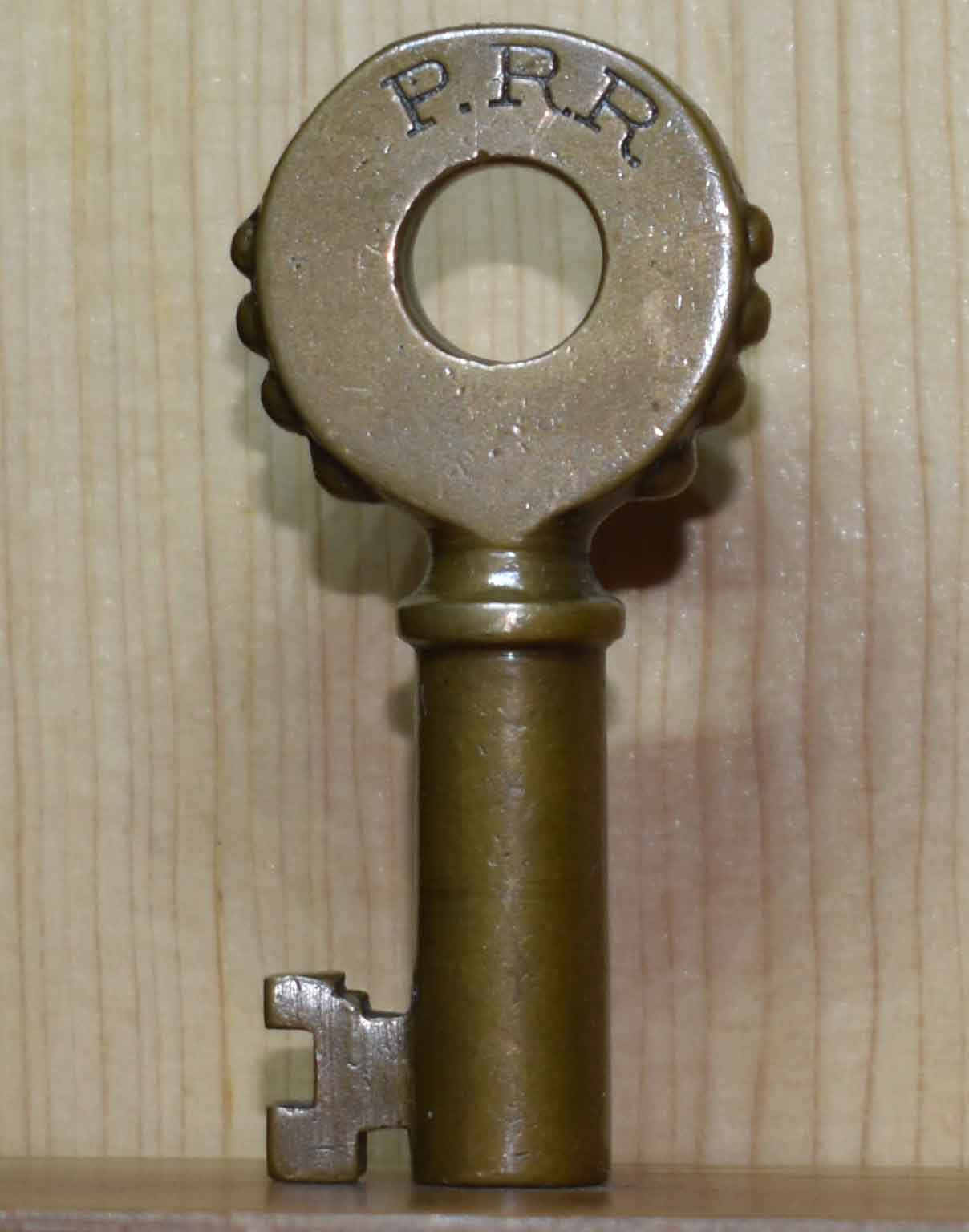 Excellent stamp marks and caramel patina. Key listed in "Don Stewart's R.R. Switch Keys & Padlocks." 100 year+ centenarian! This key stamped "RY" + keys above stamped "RR" = nice set. Rarer of the two Pere Marquette switch keys.